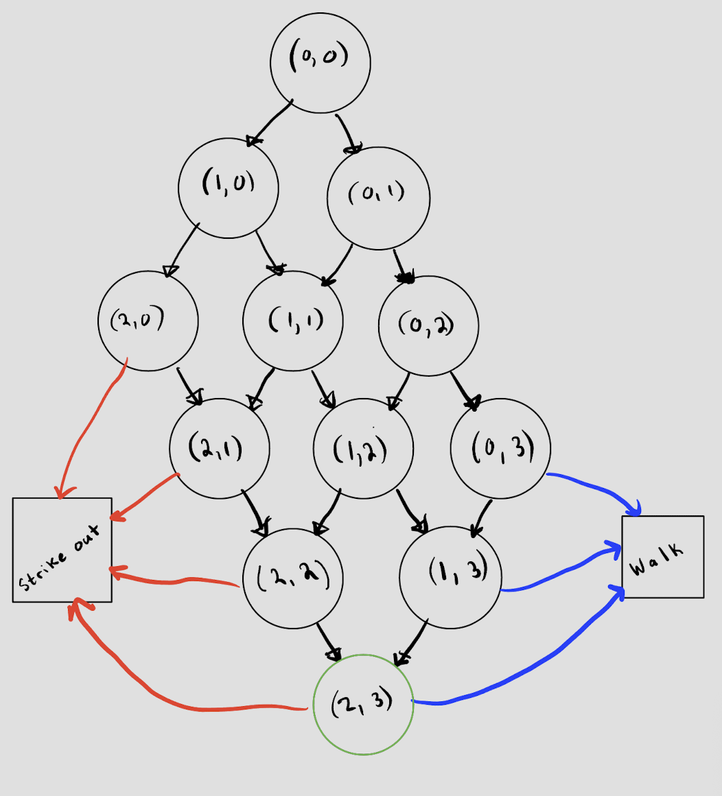 We will have the absorption states: $(b, 3)$ and $(4, s)$ for $b \in[3]$ and $s \in [2]$ which represent the outcomes of strikeout and walk respectively, and an auxiliary state that represents a Homerun, which can be reached from any non-terminal state in the game. We visualize the Markov chain below in Figure 1 (omitting the Homerun state for clarity).