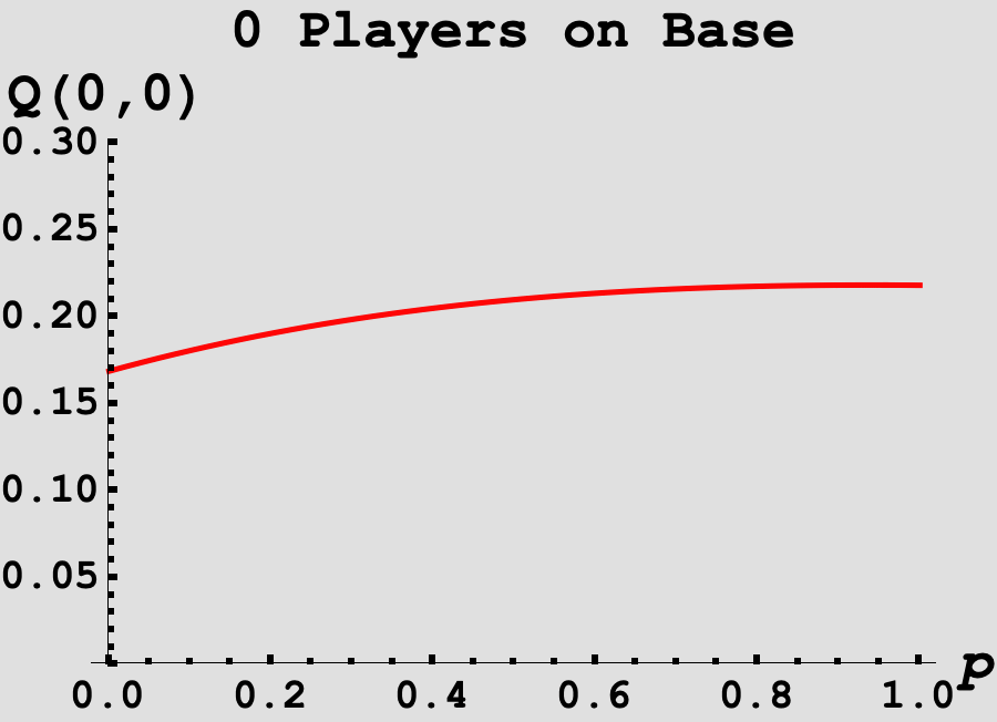 For fun, I experimented with changing the value of the Homerun state. In the given description, the value of a Homerun is 4 which implies the Batter has the bases loaded! What if this was instead a lower stakes scenario for the pitcher, and there were instead fewer points on the line if the Batter hit a Homerun. Below are the probabilities of reaching a full count, for various numbers of runners on base, as a function of $p$. We can see that with more players on base, the lower the value of $p$ needs to be to maximize the odds of reaching a full count!