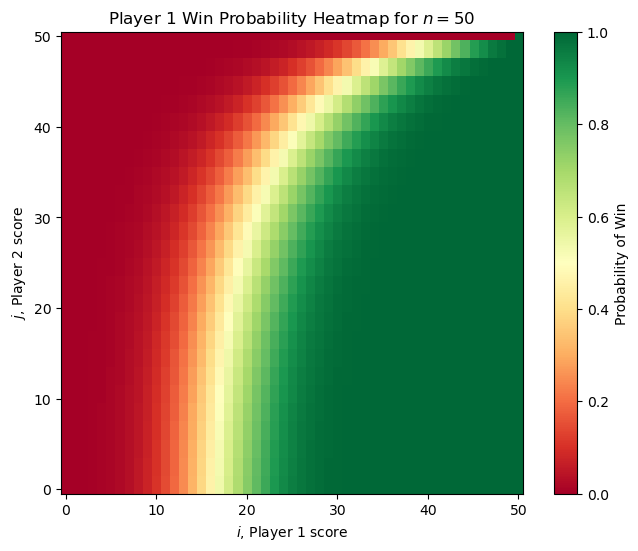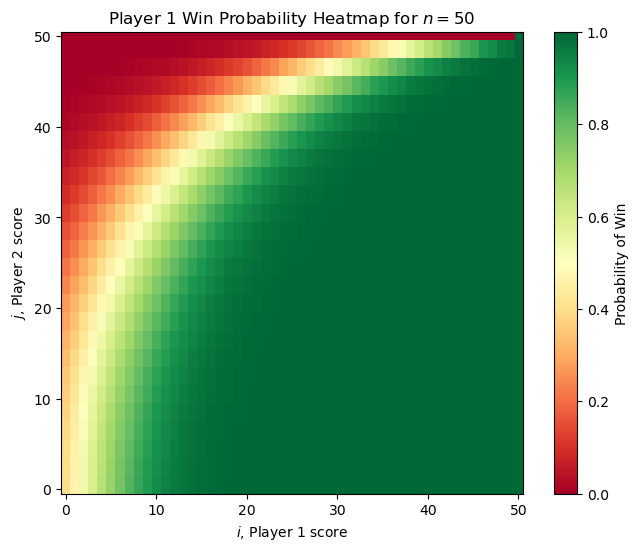 \[\begin{align} V(n, j) = 1 & \quad \forall \; j \in [n - 1] && \text{(Player 1 has won)}\\ V(i, n) = 0 & \quad \forall \; i \in [n - 1] && \text{(Player 1 has lost)} \end{align}\]Here we can see Player 1 is taking the action that maximizes their probability of winning the game given that, if they took a particular action, Player 2 would choose the action to minimize Player 1’s probability of winning under that action. We see in (\ref{eq:rec}) that in the case Player 1 chooses not to hammer, they may then face a secondary decision to accept or reject a Player 2 hammer toss, in which they would again choose the probability-maximizing action.